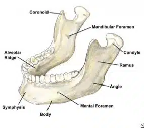 مندیبل به فک تحتانی حیوانات مهره دار گفته می شود. این استخوان توسط دو مفصل متحرک به قاعده ی جمجمه متصل بوده، متحرک ترین استخوان سر و صورت می باشد و مسئول حرکات فکین طی عملکرد هایی از قبیل جویدن و تکلم است. استخوان مندیبل شامل بخش های مختلفی می باشد: زائده ی کندیل، زائده ی کرونوئید، راموس، بدنه، سمفیز و زائده ی آلوئولی.
